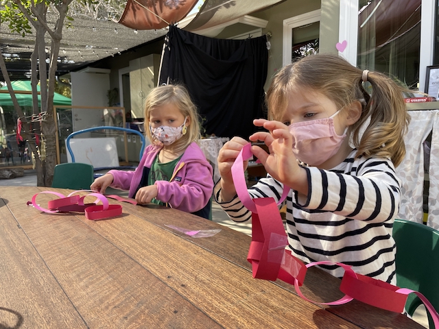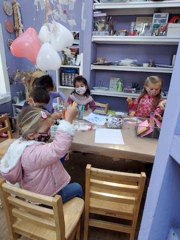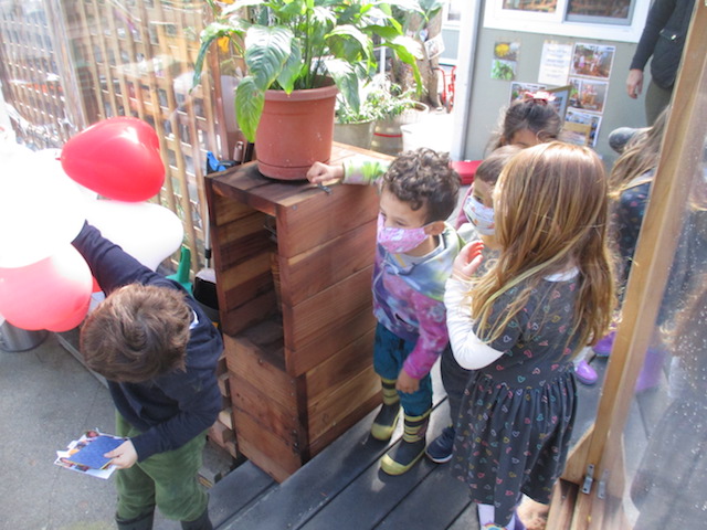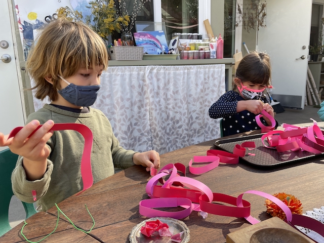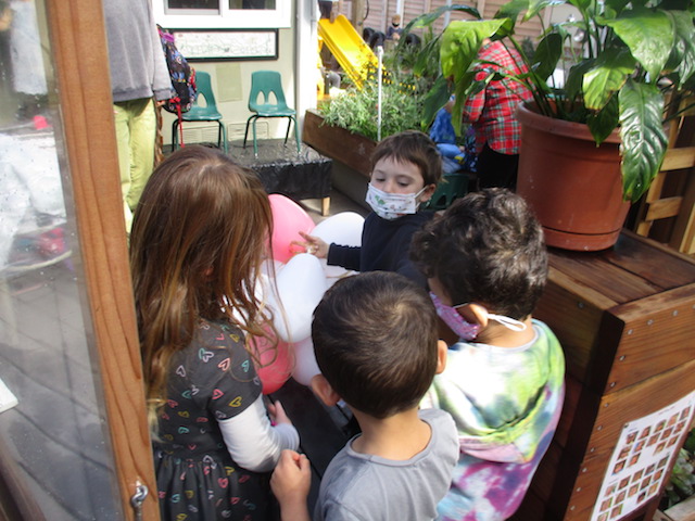 This week, the Dandelions continued to focus on making and deepening connections with each other and with our classroom spaces. The children were thinking about the Basils a lot. The children know that the Basils are the group that comes to play in our Front Yard while we go to the Woodchip Area — and we also remember that they were the ones who delivered the bouquet of balloons to our classroom over Valentine’s Day. In the Paper House and the Mini Studio, the children have been thinking about the ways in which we can send them messages of “thanks” and “I love you”: notes, cards, and gifts (balloons and necklaces).