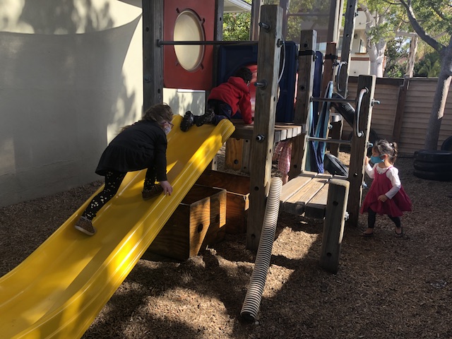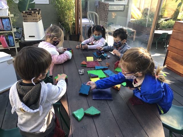 Throughout the school, areas become sets for their roles. For example, the play structure becomes a big ship that hosts a slew of characters, or the classroom living room becomes the beach as family play takes day trips away from the House Area. Recently in the Middle Courtyard, a group shared a book on space while waiting for their peers to finish snack. One by one the group grew and their conversations flowed as they turned each page of the book. When snack was over the entire outdoor group began transforming the Middle Courtyard. Moving chairs from tables and pulling out fabric, the stage was set.