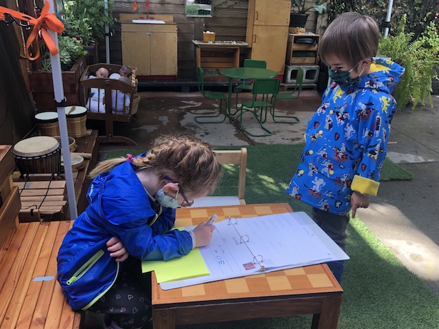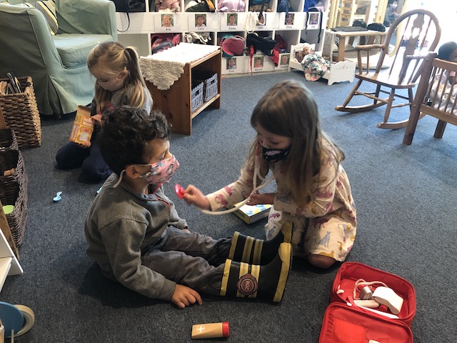 These fluid moments in the group’s play are joyful and sometimes they encounter glitches when a misunderstanding or a disagreement of the roles occur. As teachers, we embrace those moments of discourse as we see them as opportunities to support the children in developing strategies for conflict resolution. The children work together to clarify their concepts and build flexibility while listening to another’s point of view.  We will be documenting the stories as they unfold and are looking forward to the vocabulary this group will bring to the language of dramatic role playing.