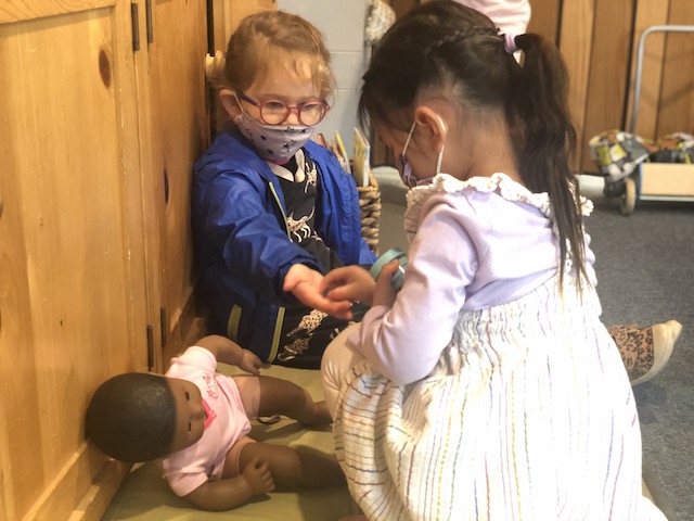 The Dandelions have also been enjoying a lot of dramatic play this rainy week. The children have been taking on roles as parents and babies; doctors and firefighters; tigers and dinosaurs; dragons and kitties. One of the wonder questions that we have on the wall of the classroom is, “What will we discover about each other through the roles that we play?”