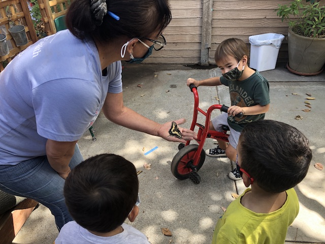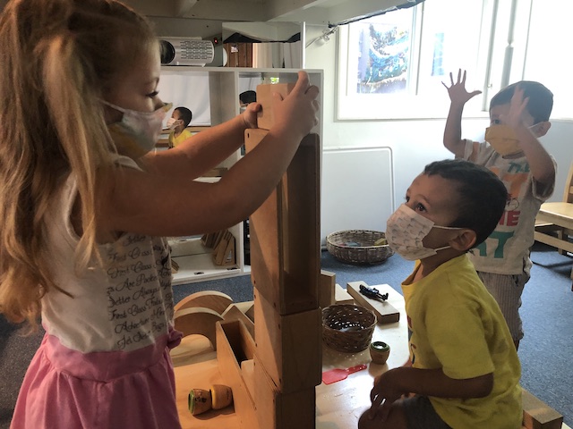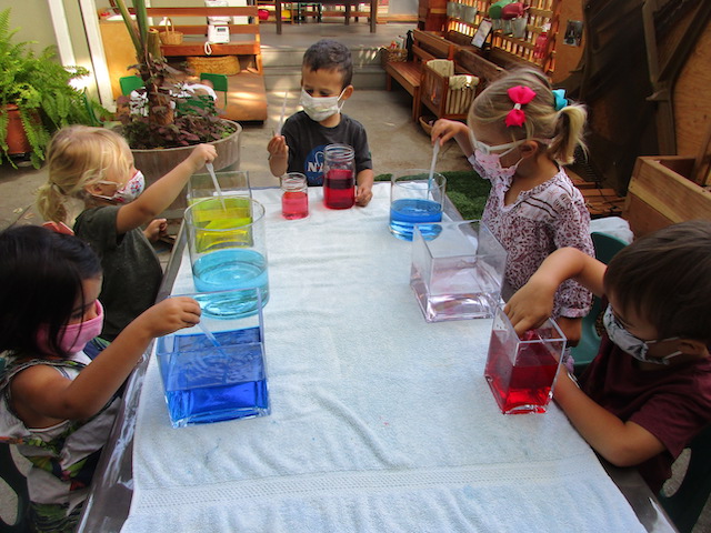 This past week, the Dandelions explored color mixing, both in large containers and in small vials, outside with Flora. They practiced using droppers, scissors, and hole punches to continue to develop their fine motor skills. In the Mud Pit, they engaged in some big body, gross motor play with the shovels. Inside with Dana in the Exploration Room, they collaborated with each other — and with the Cilantros through shared images — to build on the platform with blocks and tubes. They also used laminated photos and rosters to begin to try to match written names with their faces. Some books that we’ve read this week include Saturday by Oge Mora, Should I Share my Ice Cream? by Mo Willems, Daniel’s Good Day by Micha Archer, All Are Welcome Here by Alexandra Penfold, and Don’t Touch My Hair by Sharee Miller. These are some great books that open up conversations about community: Who are the other people in a community? Who are we in a community? How do people create a community?
