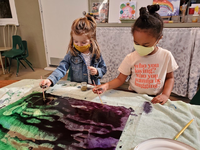 This past week, the Dandelions explored color mixing, both in large containers and in small vials, outside with Flora. They practiced using droppers, scissors, and hole punches to continue to develop their fine motor skills. In the Mud Pit, they engaged in some big body, gross motor play with the shovels. Inside with Dana in the Exploration Room, they collaborated with each other — and with the Cilantros through shared images — to build on the platform with blocks and tubes. They also used laminated photos and rosters to begin to try to match written names with their faces. Some books that we’ve read this week include Saturday by Oge Mora, Should I Share my Ice Cream? by Mo Willems, Daniel’s Good Day by Micha Archer, All Are Welcome Here by Alexandra Penfold, and Don’t Touch My Hair by Sharee Miller. These are some great books that open up conversations about community: Who are the other people in a community? Who are we in a community? How do people create a community?