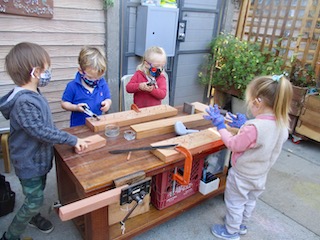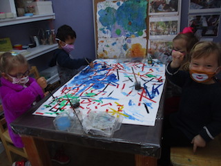 This week, the Dandelions had a very busy week outdoors! They started the process of adding water colors to the tape as a resist canvas on Monday. Using droppers or paint brushes, their piece of art is turning quite colorful and artistic!  On Tuesday and Thursday they continued to request to begin their day in the wood chip area playing games such as Duck duck goose, hide and go seek, “Monster Mash,” or creating obstacle courses. They also like to go say hi to the Aloe Vera group from the garden side and, occasionally, they request to do woodworking.