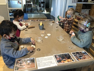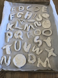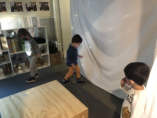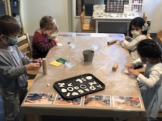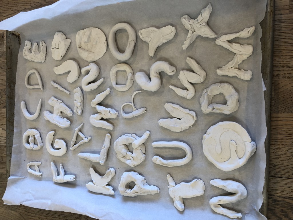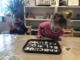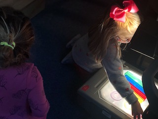 Indoors, the Dandelions continued to discover the possibilities of clay, using the sculpey to create a series of alphabet letters. At first, the children used the clay to roll “snakes,” then used the long pieces to trace the shapes and the lines of our wooden alphabet cutouts to create their own letters. Later, the children explored other ways of creating letters: making imprints with the wooden letters or using clay tools to carve out the shapes. Like the Aloe Veras in the East Wing, we hope to use these letters in our classroom so that the children can grow more familiar with the types of lines in different letters — and also the specific letters in their names and other familiar words. The Dandelions also explored straight lines, curved lines, and circles in the Exploration Room with colored, semi-transparent and opaque manipulatives on the light projector.