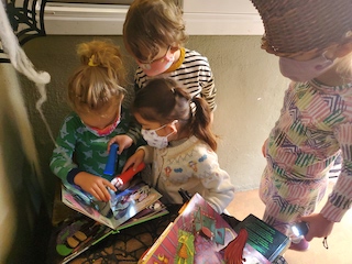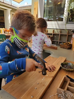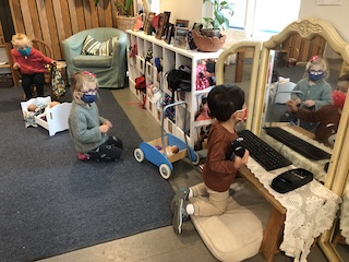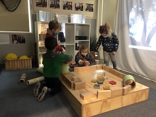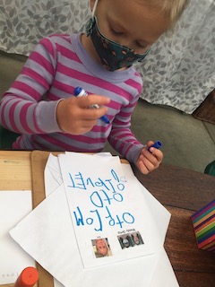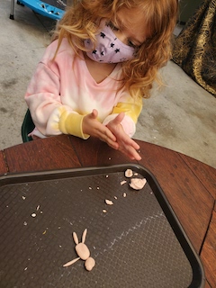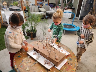 Other materials and experiences offered this week include the paints at the easels outside and the mini studio table inside; sculpey clay and clay tools; the indoor and outdoor house area; the woodchip area and structure; and note-making and subsequent deliveries through our West Wing mailbox.