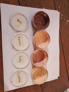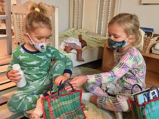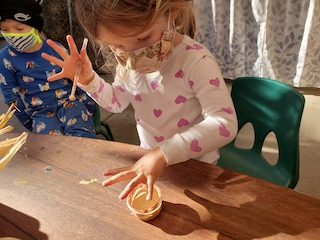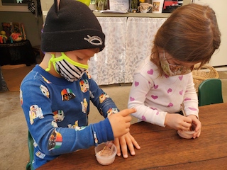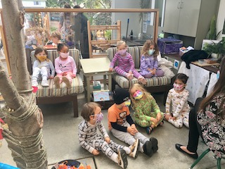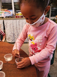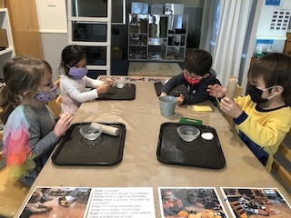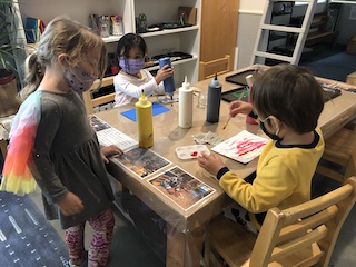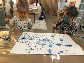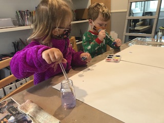 This week was so cozy being in our jammies. Although it was a short week, it was full of discoveries. Colors were mixed to discover the hues that live in our beautiful skin. With water colors and droppers, blue and metallic paints were combined. Small pools of paint mixed together, making whimsical colors and swirling designs. The children also explored how to move and break droplets with the droppers.