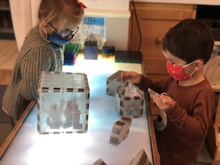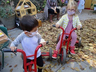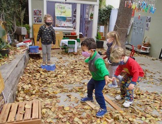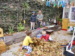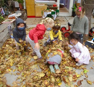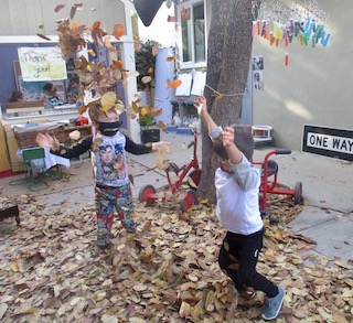 The children have been enjoying the large tree in our outdoor space all school year. We run and ride our bikes around it; we hang our watercolor vials and our windchime from it; we hide behind it in games of Hide and Seek. We’ve been watching the colors of the leaves change for the last few weeks, and now we are starting to see the brown, gold, yellow, and tan leaves fall! The children have been overjoyed to discover all of the ways that they can play with the leaves. We’ve even found ways to bring this type of play indoors to the Exploration Room. We are using the projector to put photos and videos of the tree and its fall leaves into the space, and the children are interacting with these images with flashlights, color wands, and shadow play.