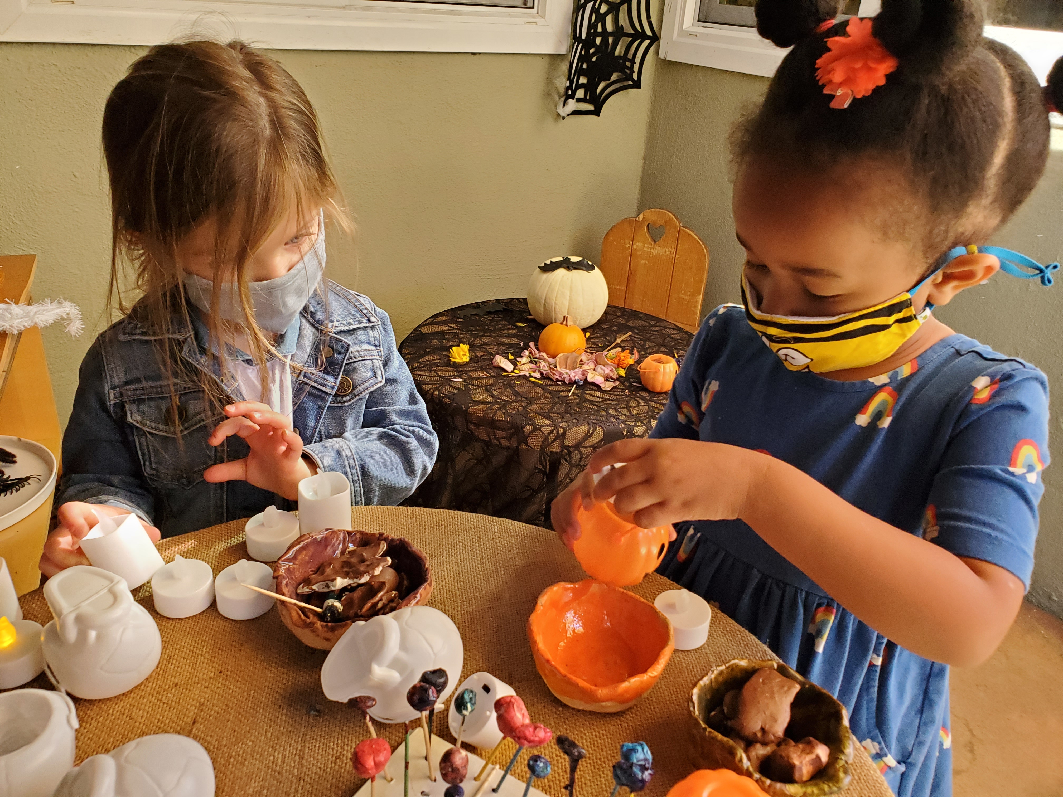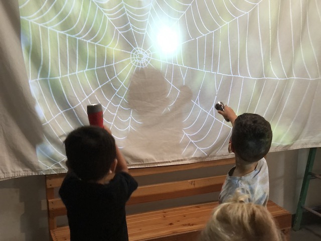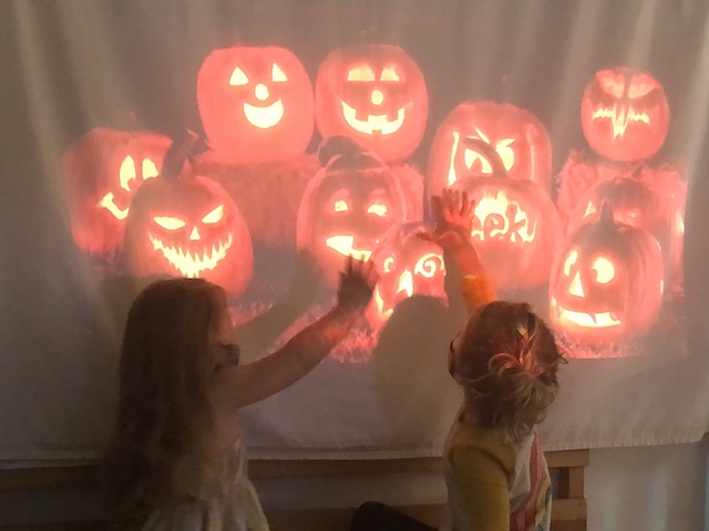 The Dandelions have been creating lots of spooky spaces in our environments in preparation for Halloween. Evelyn and a small group of children stretched out lots of spiderwebs across the mud pit area, adding some spiders to the dinosaurs who already lived there. She and some other children also decorated our “spooky” doll house in the front yard with webbing and spiders. In addition, Dana added some cobwebs and dark fabrics inside to the Exploration Room along with projections of pumpkins and spiderwebs on the walls. The children had a lot of fun adding their own shadows to the mix with the use of some flashlights. The Indoor Mini-Studio table featured an arrangement of pumpkins and gourds, which groups of children continued to use as inspiration for colors for tempera paint mixing. We later used these pumpkins and gourds for observational drawing with black felt-tipped flair pens. The House Area had pumpkins and acorns added to the baskets and the light table next to the rug had some dinosaur skeleton figurines ready to play.