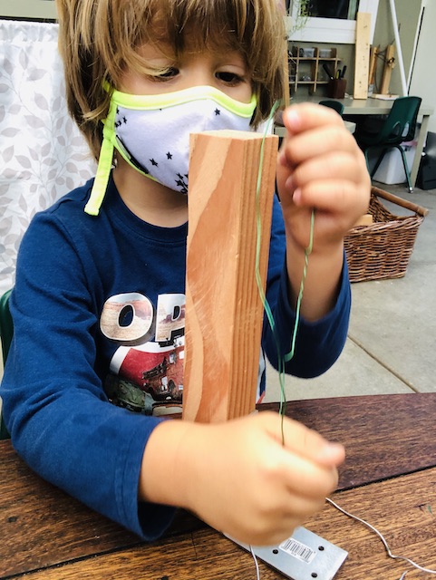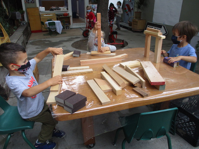 Other experiences that were offered included note-making at the Composition table; large body building outside in the front yard; the Wood Chip Area on Tuesday and Thursday. On our alternate days (Monday, Wednesday, and Friday) the children outside continue to work on developing relationships with each other and the environment. This week we introduced sandpaper blocks to help us sand off splinters from our large pieces of wood then carry them to the platform to pretend to build “castles, fire trucks, houses, and even working on an electric saw.” They also enter each space feeling more familiarized with the function of each area and the comfort to see each other on a new day. They are creating the areas a place of their own.