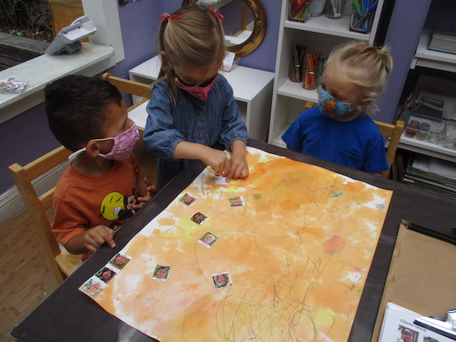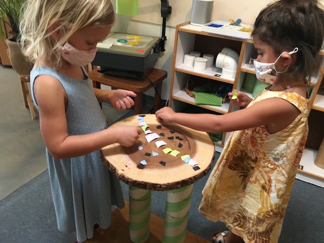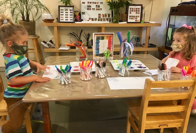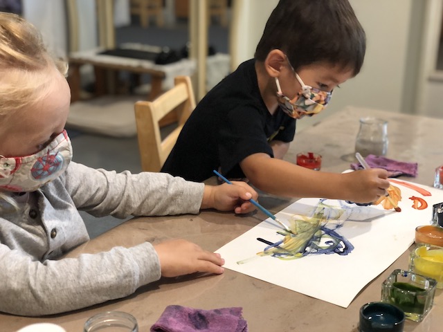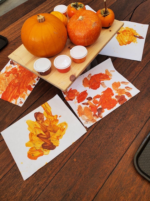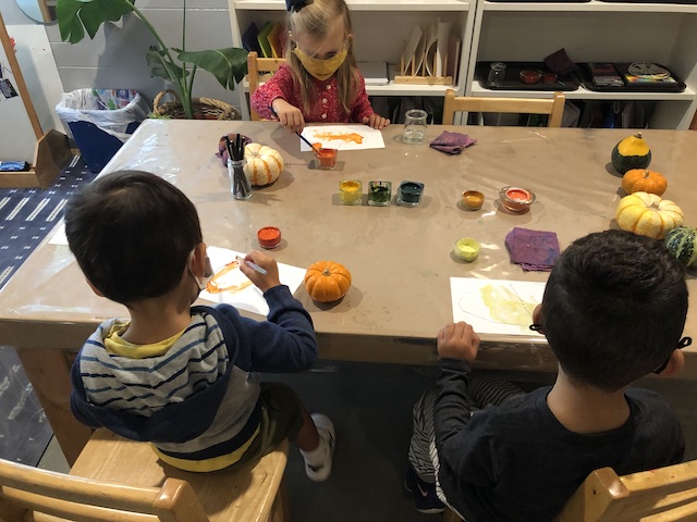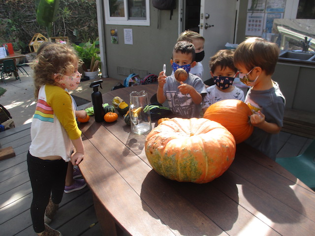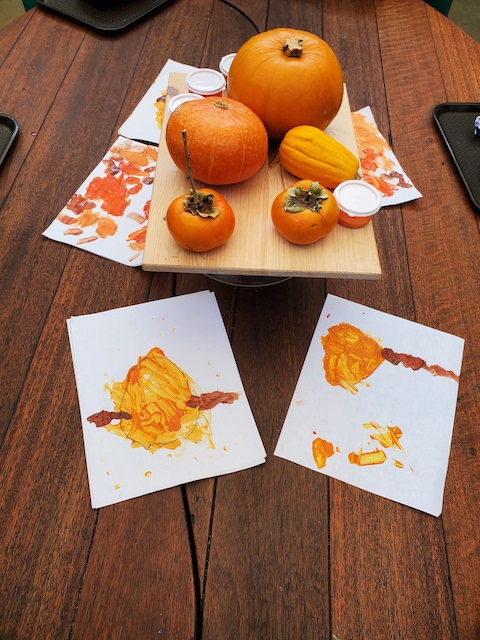 The Cilantros have been aware of colors everywhere. They are part of our language and our culture and they are a big part of how we learn. Similar to a color wheel, markers are organized in warm and cool colors to show their relationship to each other. The children are discovering each other’s favorite colors and intentionally using them in their representations when making a drawing for a friend. Color is an energy, having wavelength and frequency. We’ve observed children grouping objects by color and using that as a visual guide to locate and organize when cleaning and making a space beautiful for the next friend. The children have told us they would like to continue exploring paints by blending colors. Pumpkins and persimmons were set up in the Middle Courtyard to inspire color mixing that was added to our paint palette. After the children drew pumpkin shapes, some children filled their whole paper with paint. Color everywhere!