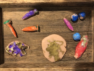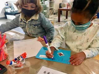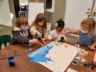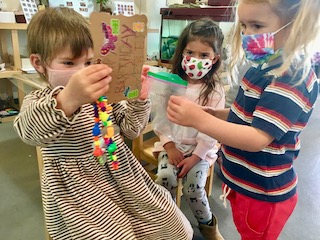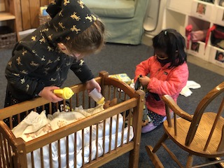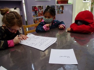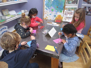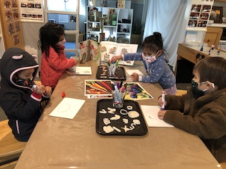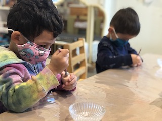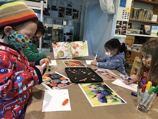 At the Mini Studio, the children continued to work in collaboration to create additional materials for the House Area. We read Everywhere Babies and We Have a Baby, and then we had a discussion about what babies like and need. Together, the children decided that the babies needed more food to eat. The group used sculpey clay to make blueberries, strawberries, carrots, pumpkins, pumpkin pie, and moon cakes. Then, using the same observational skills that we practiced when we drew our pumpkins and gourds in the fall, the children looked closely (some with magnifying glasses) at large photographs of those fruits, vegetables, and pastries to choose which color to paint the clay with our oil-based paint markers. We give the children many opportunities throughout the day to engage in free drawing and painting with the available materials in the Mini Studio or in the Paper House. During Appointment times, however, we support the children in slowing down the creative process to be intentional about their choices, both with colors and with shapes. These experiences allow the Dandelions the opportunity to deepen their observations and extend their focus, as well as to remain connected with the group on a shared task.