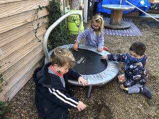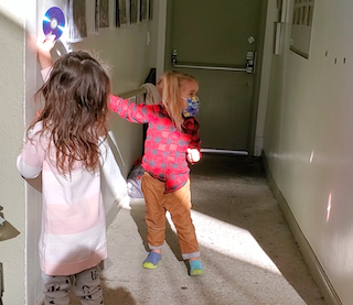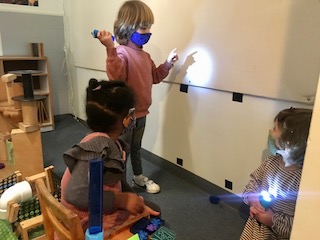 With rain in the forecast, some modifications were needed in our Middle Courtyard play spaces. One of them being our favorite area called the Party Place, previously known as the Haunted House. Knowing the children would be disappointed without their beloved dark play area, we made a commitment to make sure that the materials from the shelves would still be available for play. During a sunny break in the cloudy sky, the children discovered a rainbow on the cement while Leo and Wiley played with prisms. As they moved they noticed that the rainbow would change, or disappear, and appeared mystified by the why’s and how’s. This was a moment that brought an awareness that the sun itself offers a very magical experience and holds many illuminating wonders. For this group who loves the dark, so that they can play with light, it was a new concept. To offer more discoveries with the sun, we have brought out multiple materials such as old CD’s, small mirrors, prisms, and crystals to play with both reflection and refraction. This is the beginning of a new exploration and, if the sun happens to peak out this weekend, we hope you can join the fun too.