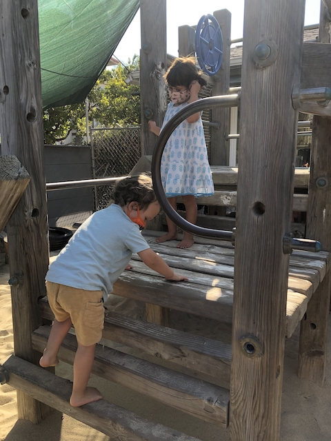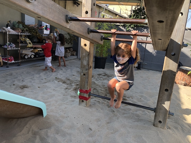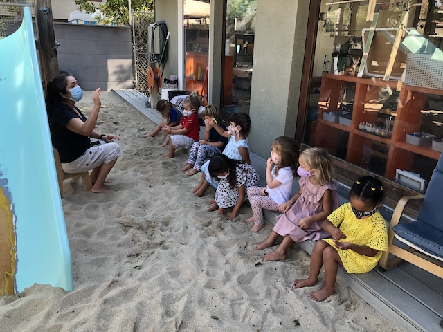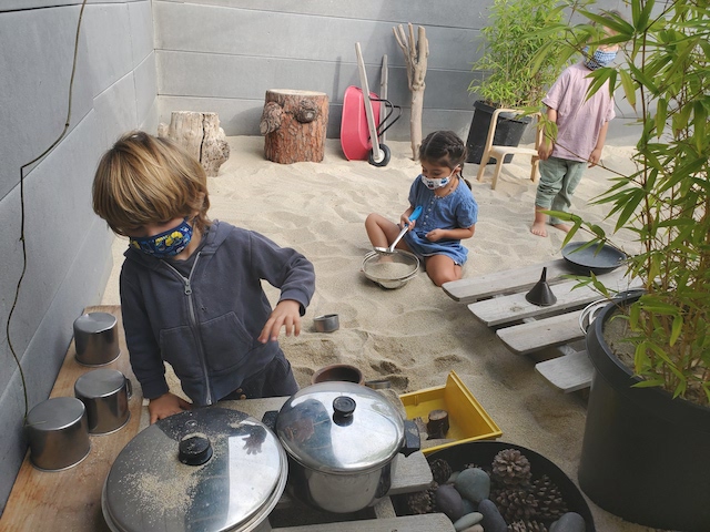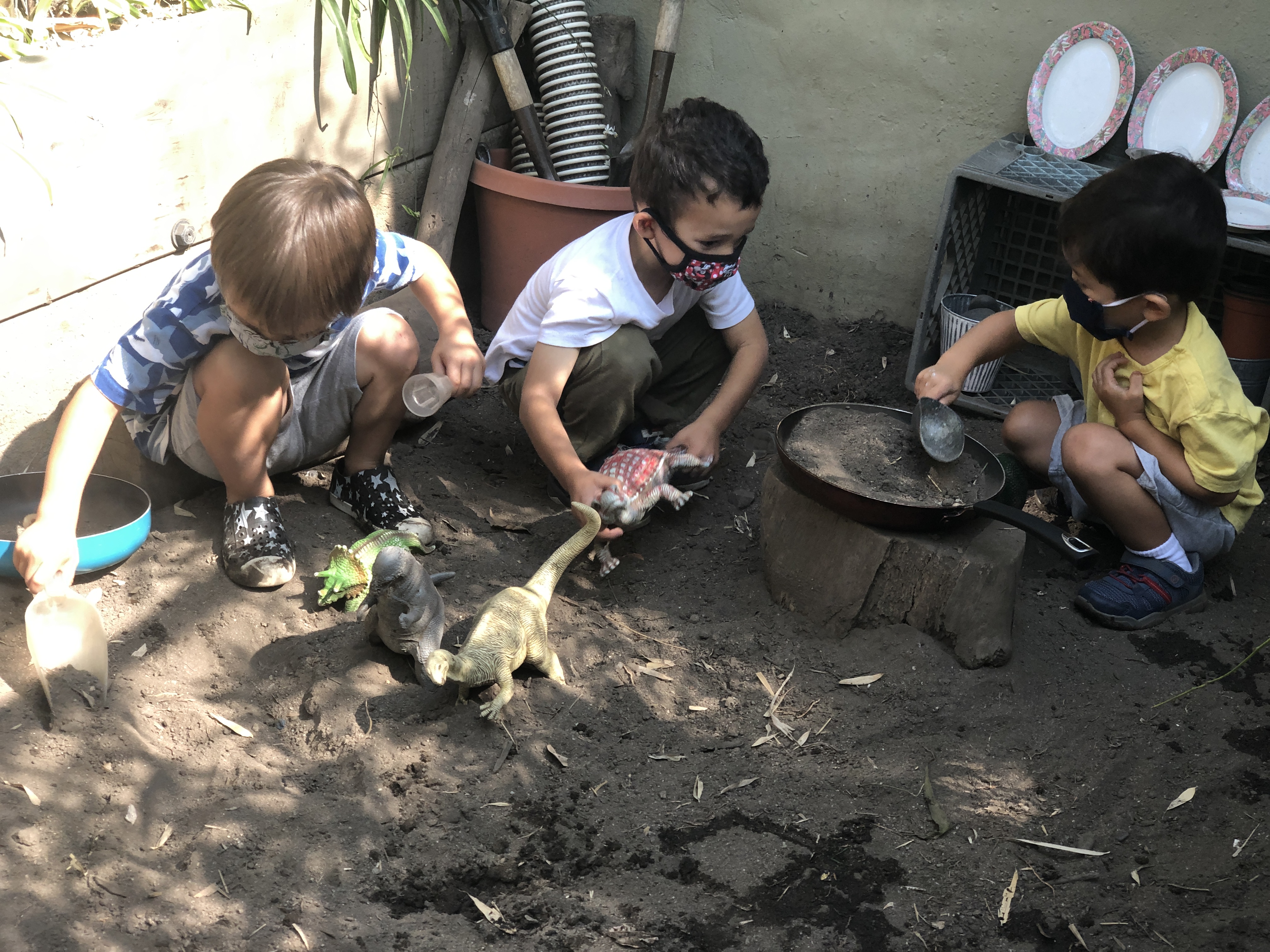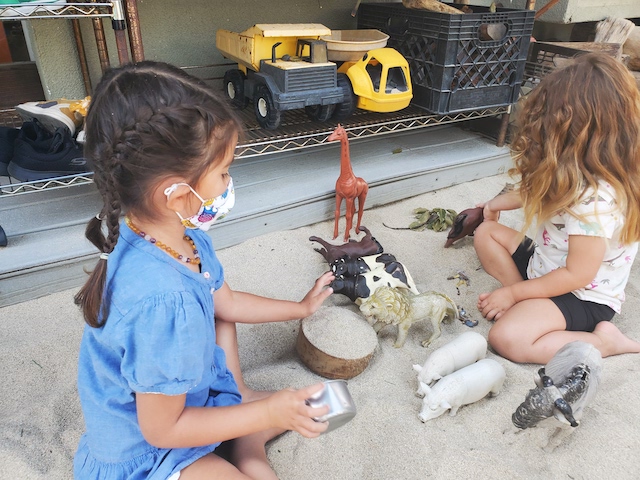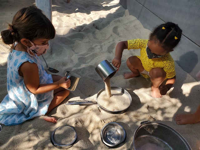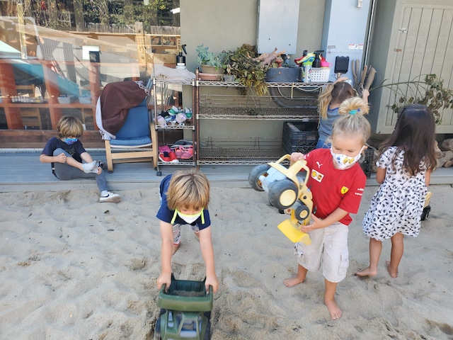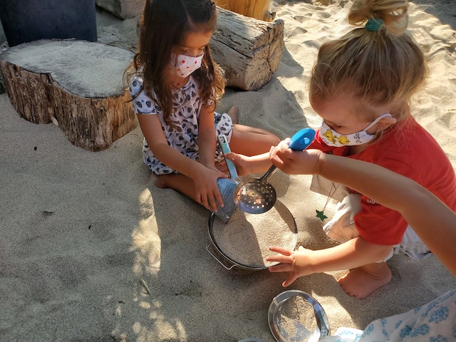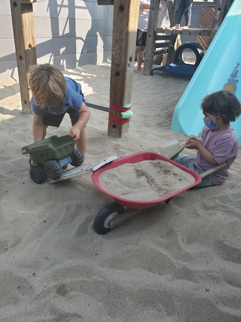 has been having fun developing their large motor skills as they use our scooters, trampoline and our new bike in the Middle Courtyard. Now the Sand Area has given us new challenges as we climb, try the monkey bars, push tractors through the sand, and pull heavy sand-filled wheelbarrows. We are also enjoying the rich sensory experiences that the sand offers such as digging, sifting, and pouring and, of course, cooking up delicious meals to serve one another and the many toy animals and fairies who live in this space. Our current plan is to use the Sand Area on Wednesday and Friday mornings. Also highly discussed is Halloween. This group is wanting to build a haunted house. In addition to pumpkins and gourds, they would love to add black cats, cobwebs, spiders, skeletons, and ghosts. If you happen to have any child friendly items to contribute, let us know and we will be very happy to put them to a spooky use.