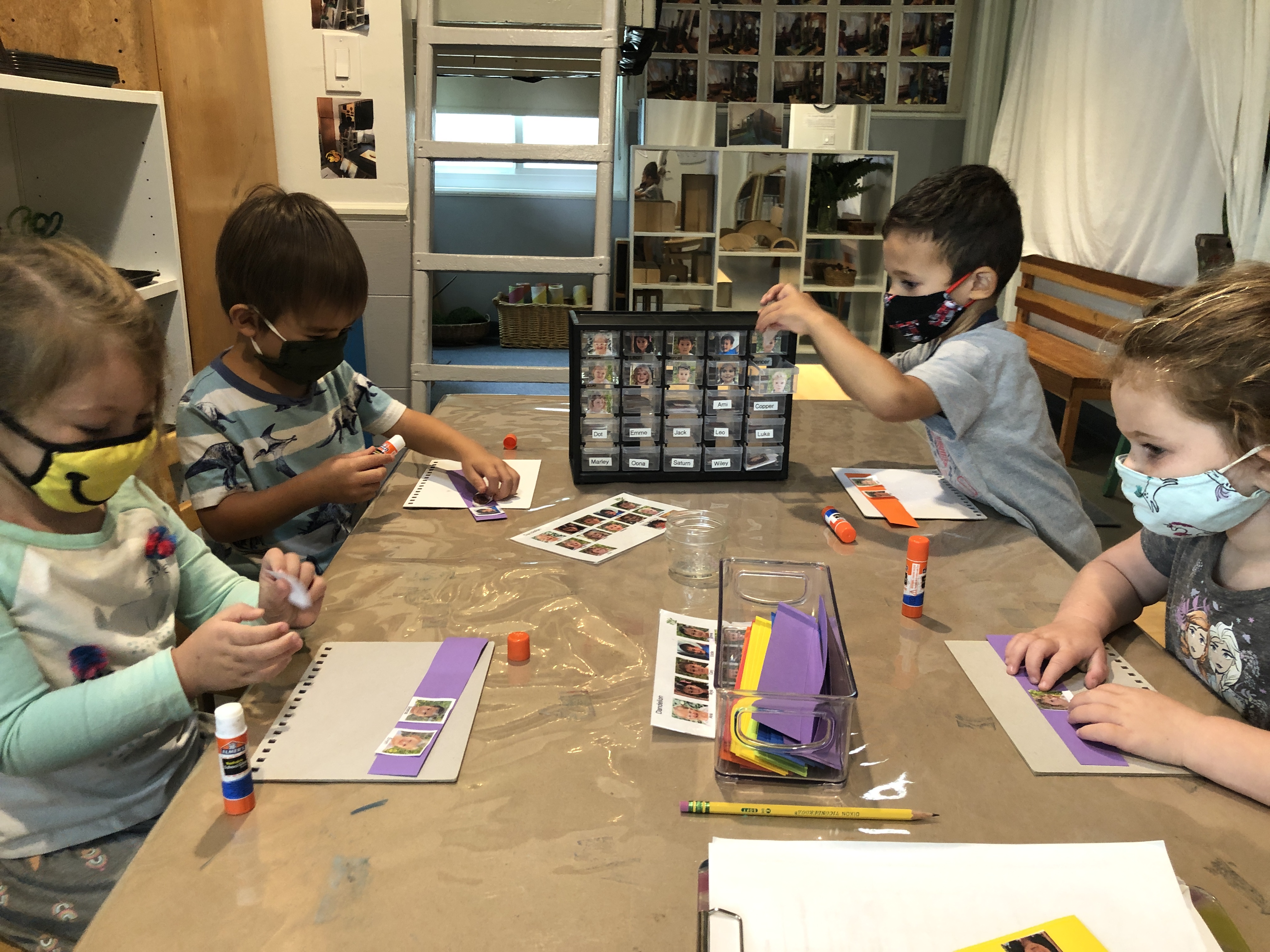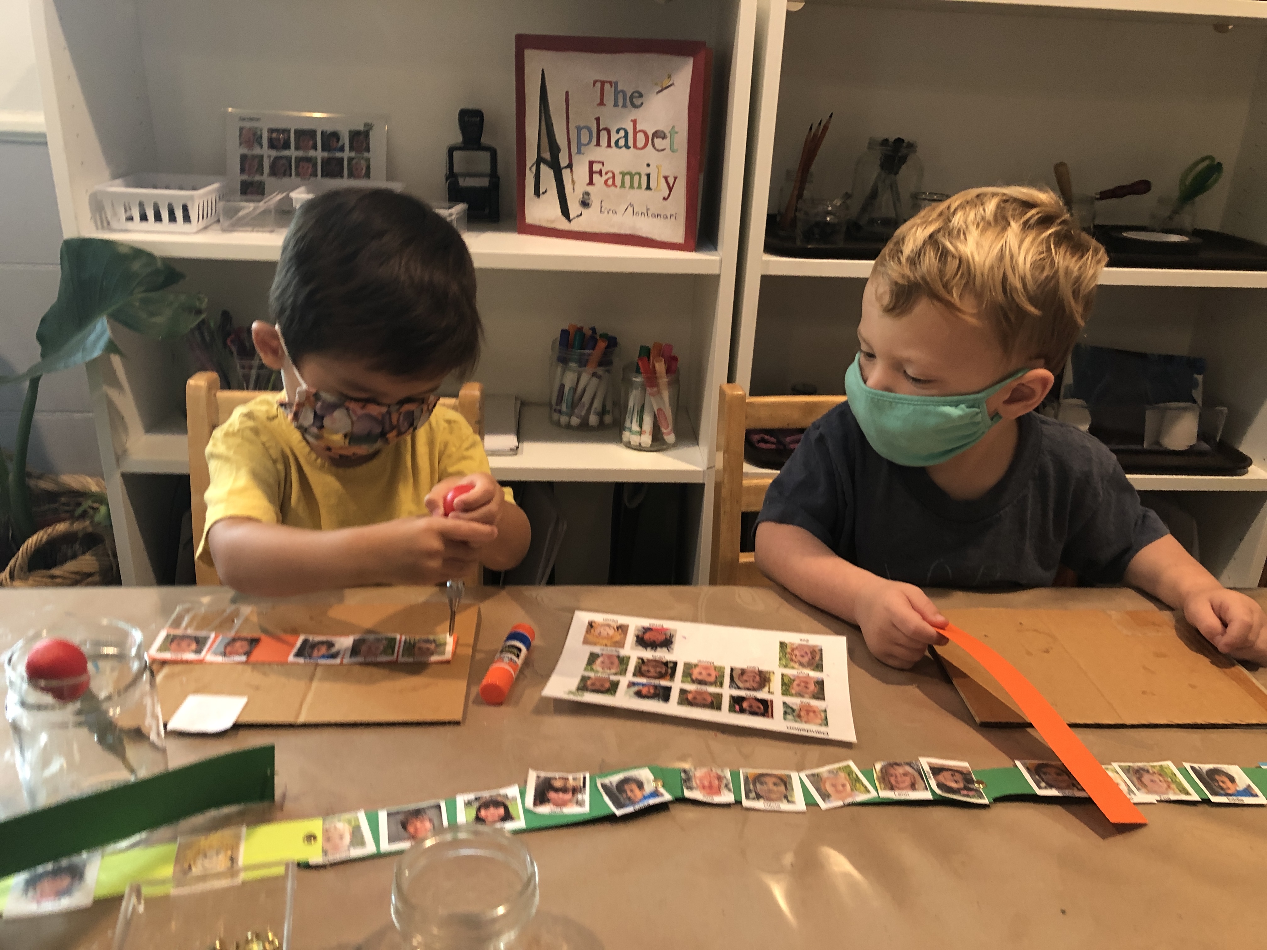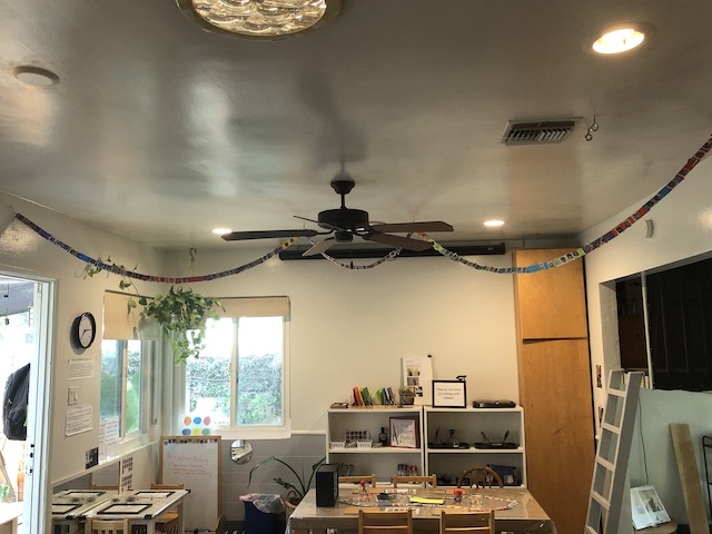 is saying thank you to the Basil Group for agreeing to switch outdoor space twice a week (Tuesdays and Thursdays). The Dandelions enjoyed climbing, sliding, swinging in the hammock, crawling through the tunnel, running, and jumping on the trampoline in the front Wood Chip area. On our alternating days, we continued to build relationships with our spaces in the front yard. We worked together to rearrange the house area and large building block spaces. Inside the Dandelion classroom, the children were also discovering new possibilities in the indoor house area: serving tea, working on the keyboard in the “office,” and having many birthday parties with our flameless candles. At the mini studio table, we wondered, “How are we making connections with one another?” We explored this question through the use of paper copies of our West Wing headshots, as well as adhesives like glue sticks and connectors like awls and brads. Take a look at how long our chain of connections has already grown!