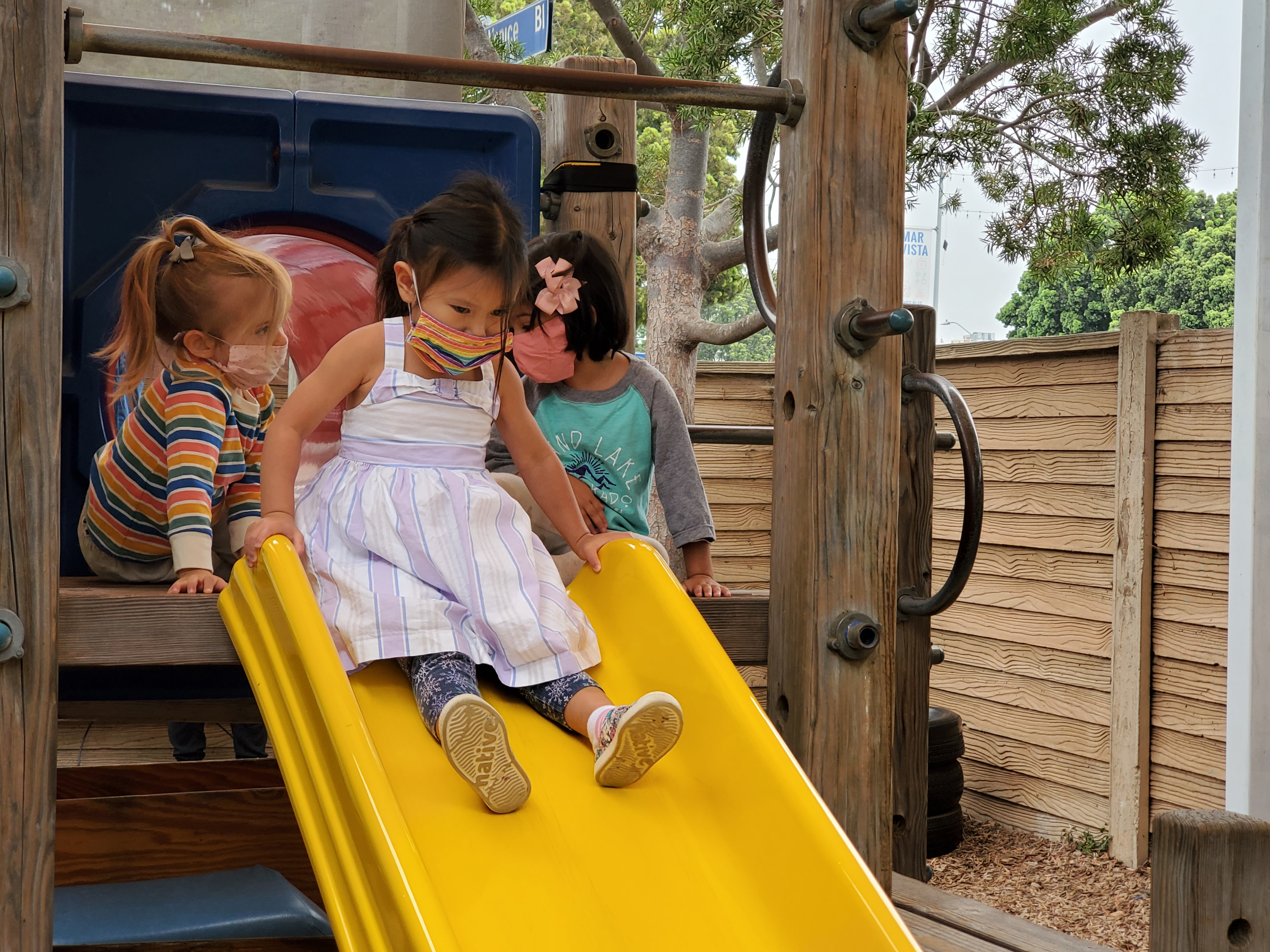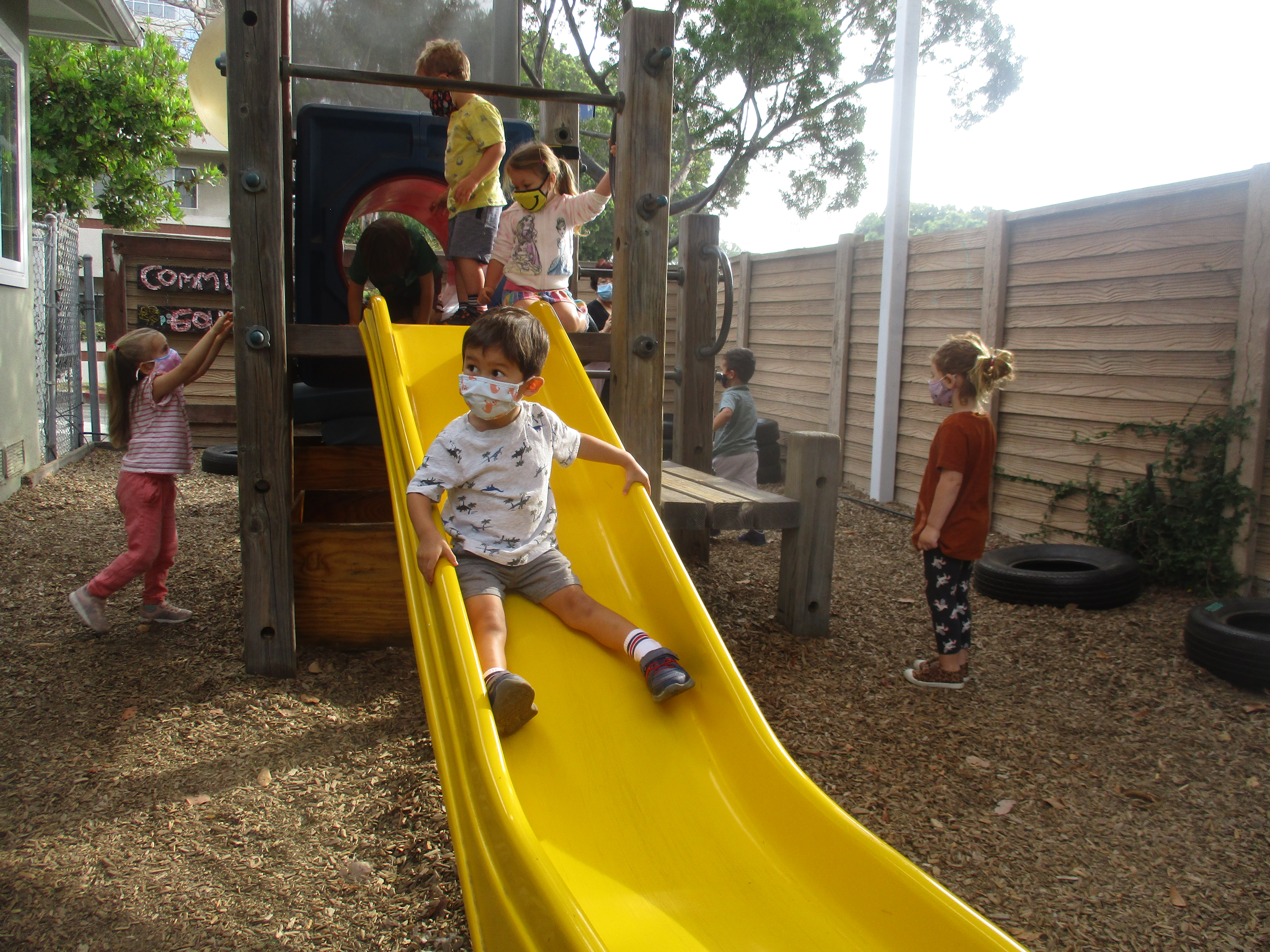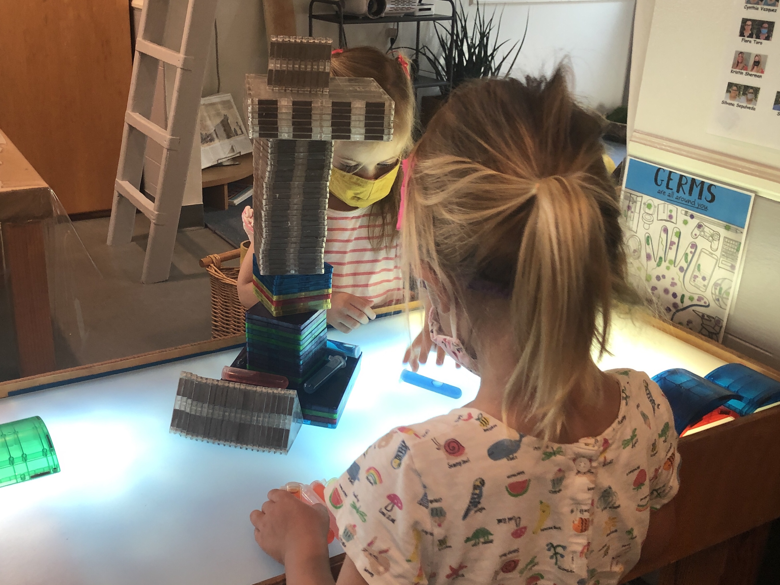 is saying thank you to the Basil Group for agreeing to switch outdoor space twice a week (Tuesdays and Thursdays). The Dandelions enjoyed climbing, sliding, swinging in the hammock, crawling through the tunnel, running, and jumping on the trampoline in the front Wood Chip area. On our alternating days, we continued to build relationships with our spaces in the front yard. We worked together to rearrange the house area and large building block spaces. Inside the Dandelion classroom, the children were also discovering new possibilities in the indoor house area: serving tea, working on the keyboard in the “office,” and having many birthday parties with our flameless candles. At the mini studio table, we wondered, “How are we making connections with one another?” We explored this question through the use of paper copies of our West Wing headshots, as well as adhesives like glue sticks and connectors like awls and brads. Take a look at how long our chain of connections has already grown!
