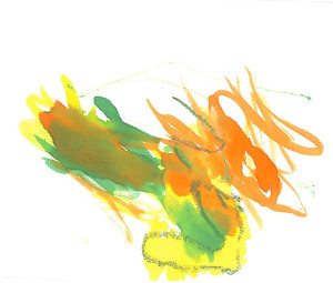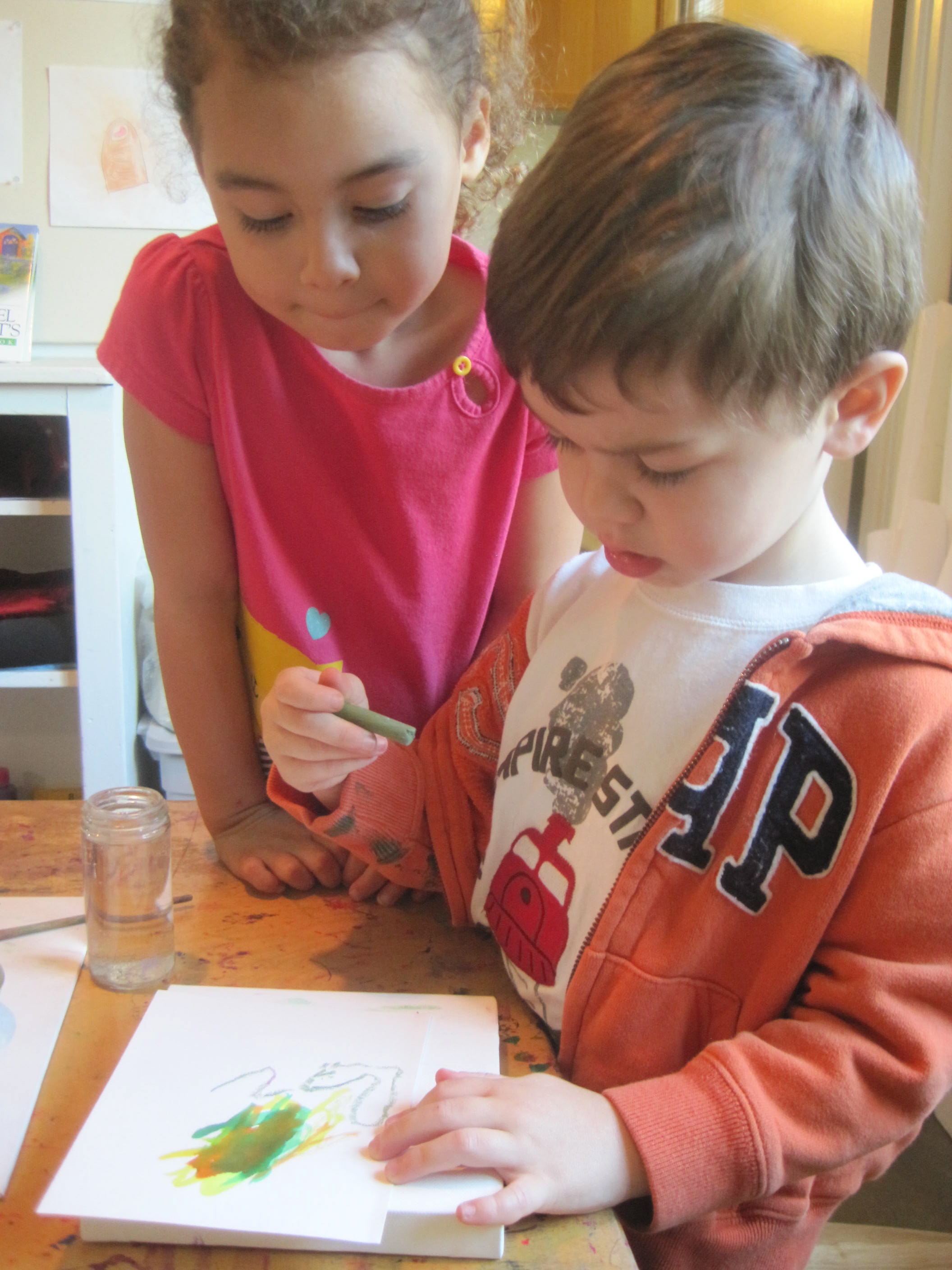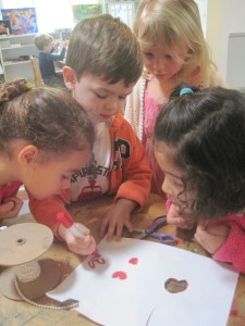 Carla: “Yes. You need to make two little bumps on the top and a triangle at the bottom. And then color it in… keep the lines inside the heart. Now you.” <She hands David the marker.>