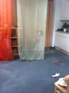 Cynthia noticed a group of children ‘performing’ without a real story. The children asked her to make a curtain for their work. Cynthia (on step stool with arms extended over her head for longer than she liked!) taped two fabric panels to the ceiling.