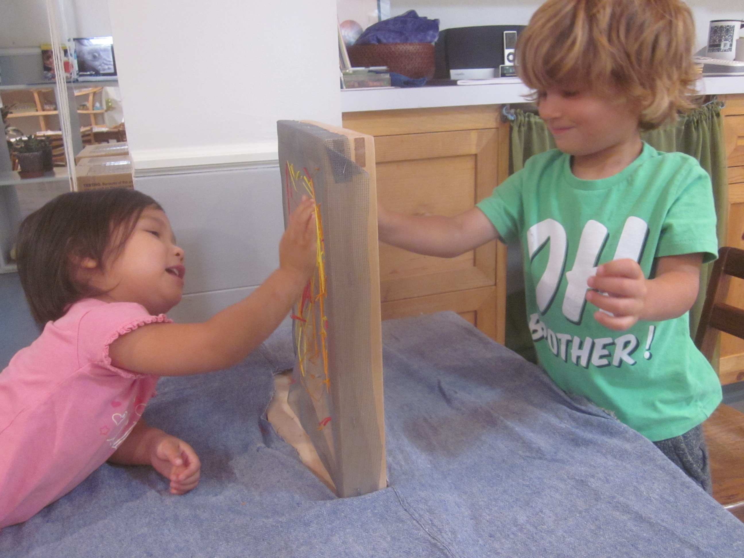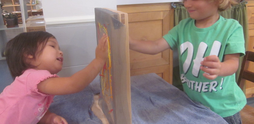 This is not a space where a child can work alone or even parallel (alongside, but not engaged) with a peer. If they want to play, the game necessitates that they must begin by finding a partner. They must be present and attentive during the game. It requires looking at their partner and reading their face and body language for cues to the giving and receiving of the needle attached to the thread. -Studio Teacher Amy
